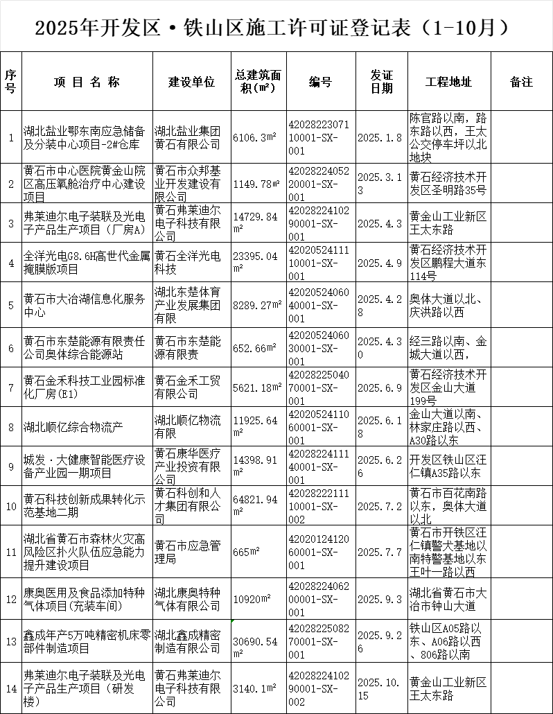 2025年開發(fā)區(qū)·鐵山區(qū)施工許可證登記表(1-10月)